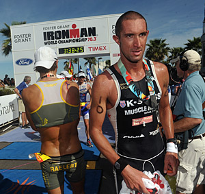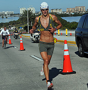 With his performance Raelert emerged from the shadow cast by his older brother Andreas, who slashed past a dozen competitors last year with a 1:10 run to finish in second place, and who made an impressive Kona debut during which he dueled for 10 miles with Craig Alexander before finishing third. Despite looking like a Chippendale dancer as he almost ran out of his race pants, Michael Raelert also looked as if he wasn't breathing hard when he hit the line.