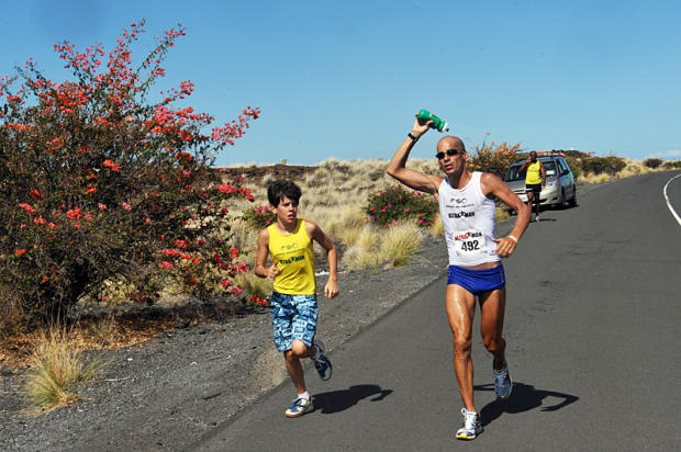 Alexandre Ribeiro cools off with 5 miles to go, flanked by his son Kaipo.