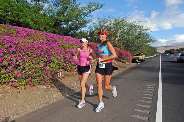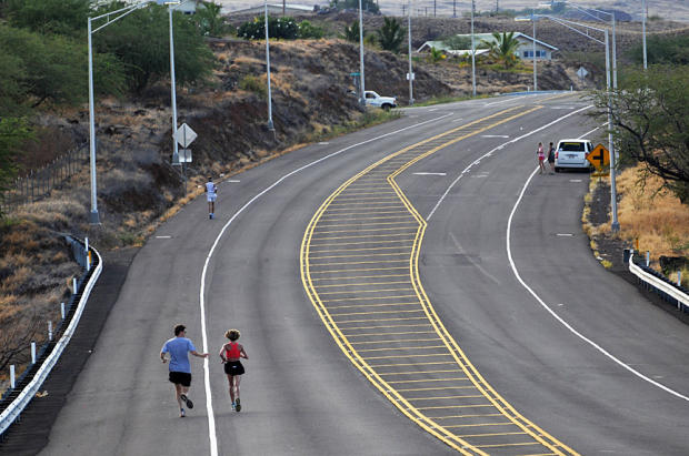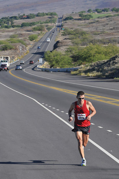 Ultraman runners and support vehicles hop scotch south along the Queen K.