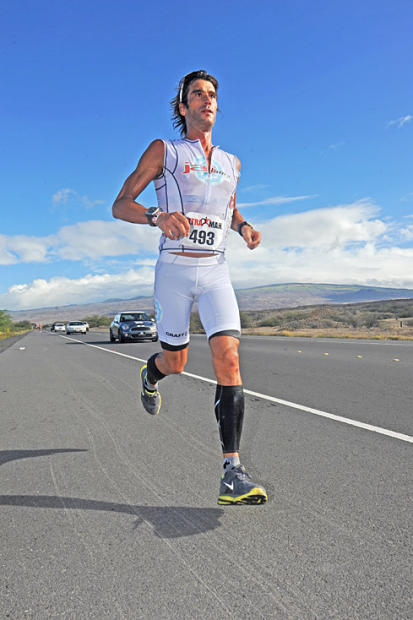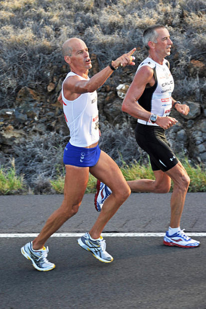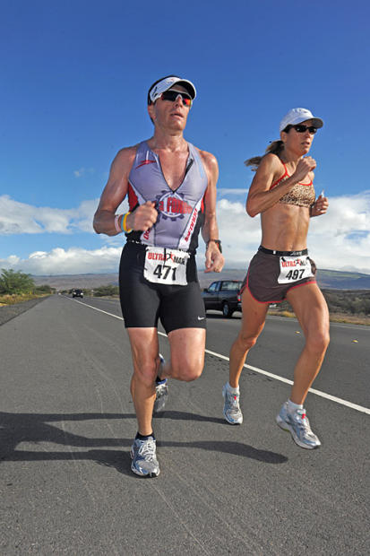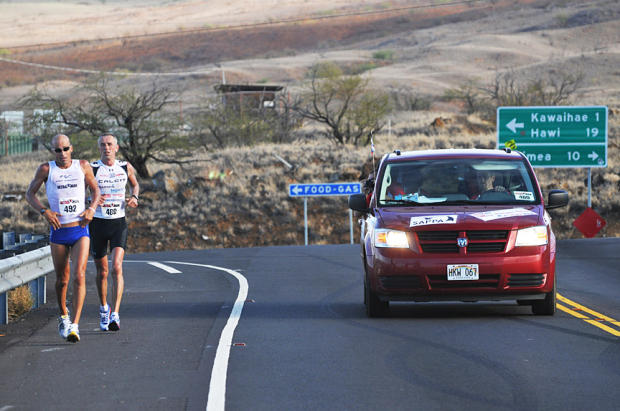Ribeiro and Kregar run in tandem as Kregar’s support vehicle makes the turn on to the Queen K at Kawaihae.