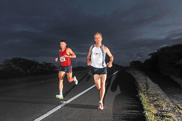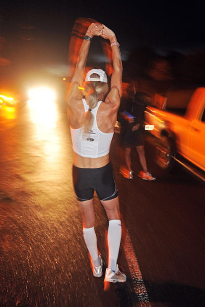 Veteran Ultraman Uli Winklemann of Germany looks flexible and fluid in a pre dawn stretch.
