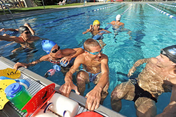 R to L – Gordo Byrn, Justin and Belinda Granger, Armando and Laura Bennett (background), and Simon Thompson take a break during a workout at Spruce Street pool in Boulder.