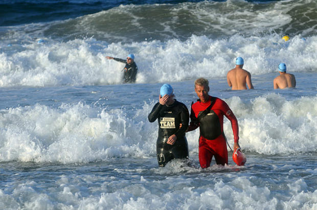 Disappointed age grouper gently escorted back to shore when the 5-foot shore break waves proved too big to navigate at Kaiser Permanente Los Angeles Triathlon.
