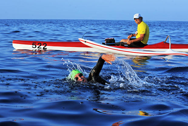 Ultraman swimmer and kayak escort.