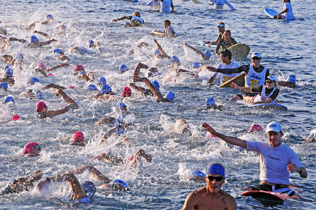 Traffic cops on surfboards help keep the swimmers at Ironman Hawaii on course.