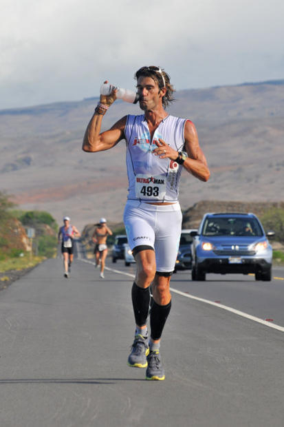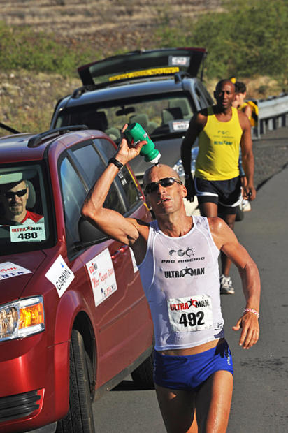 Richard Roll savors a drink on the anvil-hot macadam of the Queen K at Ultraman.