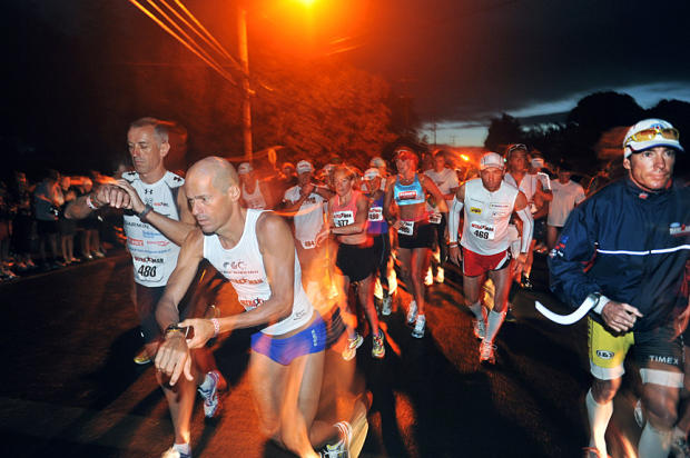 Alexandre Ribeiro and Miro Kregar check their watches at the beginning of the Ultraman final day double marathon.