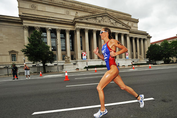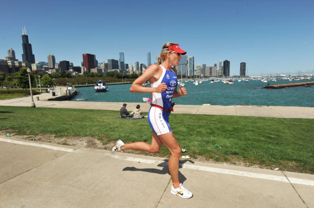 Sarah Haskins strides past Chicago’s impressive glass and steel buildings at Monroe Harbor on her way to victory.
