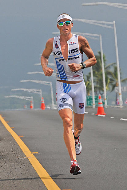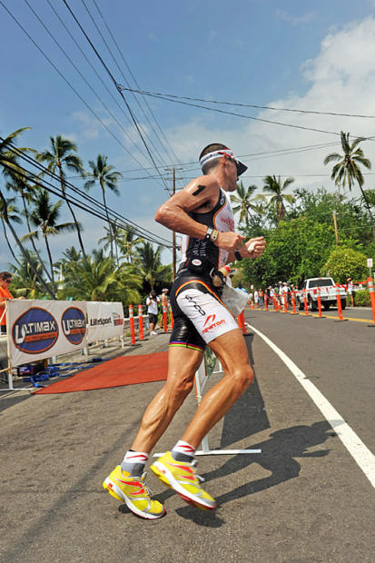 Craig Alexander hooks up for an 8-mile duel with Michael Raelert midway through the run at Kona. Overgrown bananas outside aid stations not regulation nutrition.