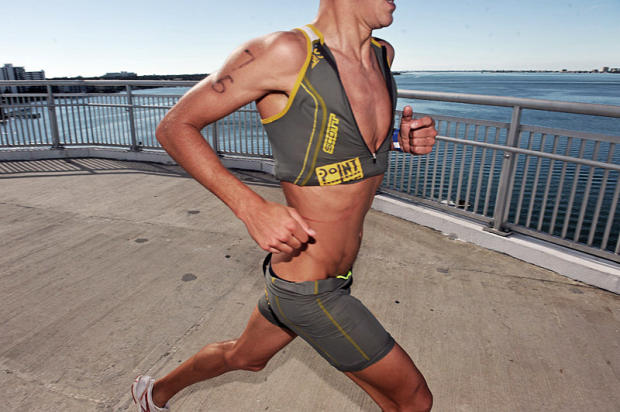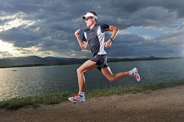 Two time Ironman Hawaii champion Craig Alexander in full stride for a photo shoot at the Boulder Reservoir.
