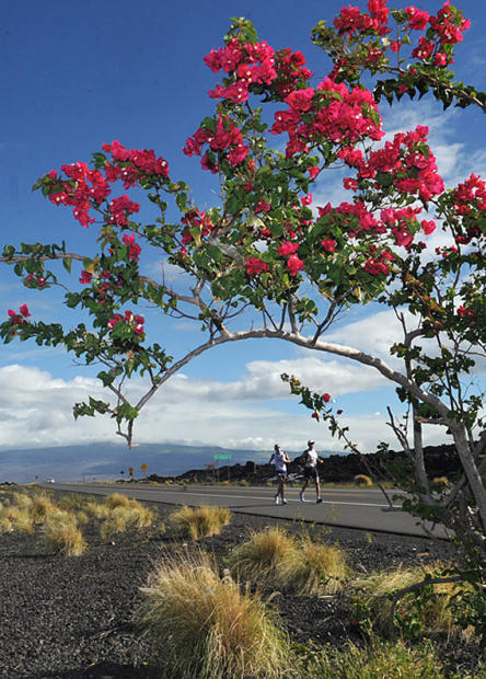 Running past the bougainvillea on the lava fields at Ultraman.