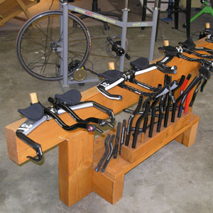 I rooted around the Compound for relatively twist-free lumber and commenced. The idea was this: make room for at least 4 aerobar set ups, high enough off the ground so that the average person could bend over at the waist, place his or her elbows in the cups and, positioned assumed, determine whether this set of contact points represented comfort. Or not. Then, move 18 inches to the left or right and try again on a new set up.