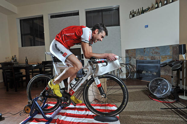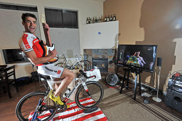 Warming up for a 90-minute CompuTrainer session on his new Argon 18 bike, O’Donnell plays to the Beatles Paperback Writer in Guitar Hero.