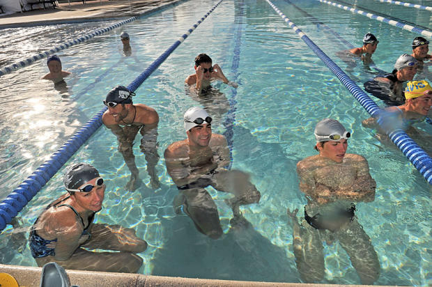 Fast lane swimmers try to stay warm before a set.