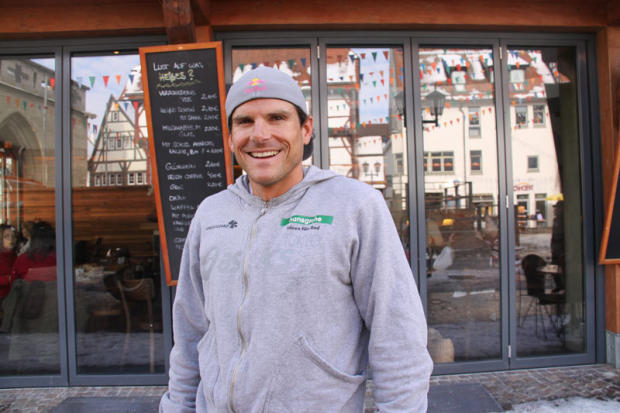 Unger stretches in front of the Goelz Raeder bike shop in Bad Saulgau and readies himself for a run