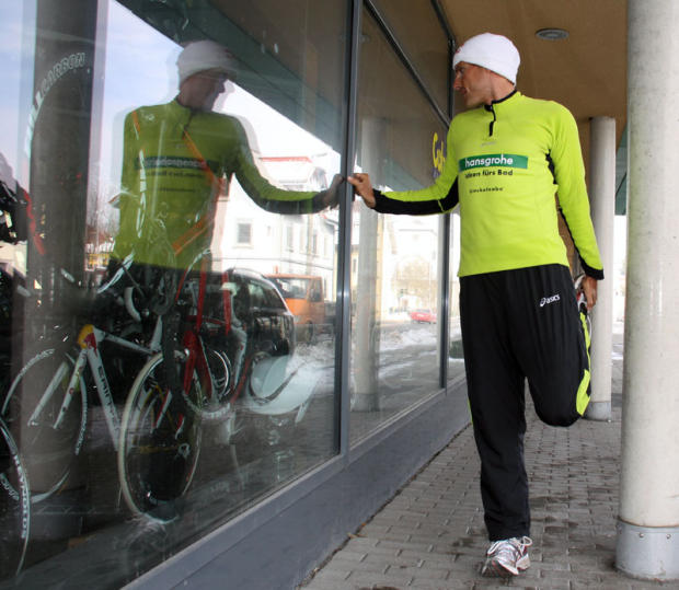 Unger stretches in front of the Goelz Raeder bike shop in Bad Saulgau and readies himself for a run
