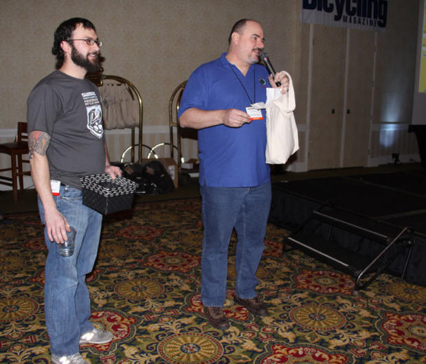 Show promoter Don Parker raffles of some goodies at the obligatory trade show party