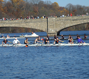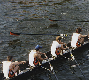 Jordan: Ironically, it's those very perceptions that led me to rowing. Because that is how I saw rowing. And, to some extent, it's how rowers want to be seen. But it's not really what the sport is like. That was enormously frustrating on numerous occasions. Because the illusion is what I really wanted rowing to be like. I wanted it to be about nothing but dogged determination and willpower and willingness to train over and over and over. In the most pure moments of rowing though, it's the ultimate team sport. What this really means is that it's impossible single any one out. The best rowing is when the boat is one entity. You have eight people rowing this really long, really skinny boat with these massive oars. And everything must be in sync. The oars must drop in together. Everyone must lock on to the water together. And then everyone must push at the same pace and effort as everyone else. And you must do this all while your HR is basically maxed out, your lungs are burning, and your legs feel like someone is stabbing them. So you have this maximally intensive sport that nevertheless requires this unbelievable rhythm and timing among eight people. But my favorite moments were not the races. It was those moments in training – usually in the early evening – when we rowed with "swing," which is when the boat just flows. Everyone is in timing. And the strokes just happen. It's beautiful. You feel like everyone is working together and you are achieving something greater than you could on your own. It's those moments that I miss. There is no individuality. There is no ball hogging or showboating. It's perfect synchronization. No other sport can match that. The closest analogy to rowing is really three-legged racing. Imagine the timing required to run with someone with two of your legs tied together. Now imagine eight people doing this, only you can't really see anything, and you rely on a little person yelling at you for orders. Now imagine that it can be done perfectly in sync. And that's rowing.