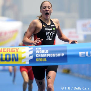 Jan Frodeno of Germany, who won four-man finish line sprint for Olympic gold in Beijing two years ago, won an even closer sprint to the finish with one stubborn competitor Saturday for the men’s win at round 2 of the Dextro Energy Triathlon ITU World Championship Series in Seoul, South Korea. In the women’s contest, Daniela Ryf of Switzerland sprinted past Chile’s 2010 sensation Barbara Riveros Diaz, 2009 ITU World Championship Series winner Emma Moffatt of Australia and New Zealand’s Andrea Hewitt for a three-second margin of victory.