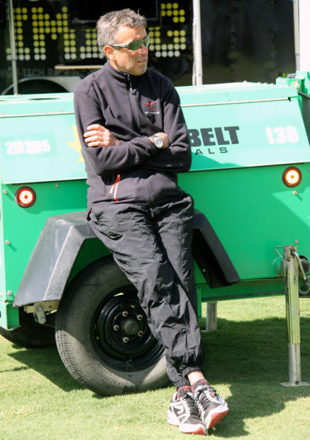 Toni Hasler waits patiently for his wife Natascha Badmann.