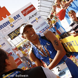 Bockel quickly passed Kuttor and took the lead during the early parts of the bike segment but ITU pro Filip Ospaly, 4 time Ironman Austria winner Marino Vanhoenacker and defending champion Chris McCormack were in hot pursuit. Swedish Pro Jonas Djurback and Ironman Hawaii 2009 third place getter Andreas Raelert were also right within striking distance. The lead changed a few times with Ospaly charging to the front and other trying their luck too, but in the end it was Vanhoenacker who got away late. By the time the Belgian hit T2 he had about a 40 second lead on Bockel, McCormack and Ospaly. With the fastest bike split of the day (2:07:10), Weiss arrived in T2 in 5th position.