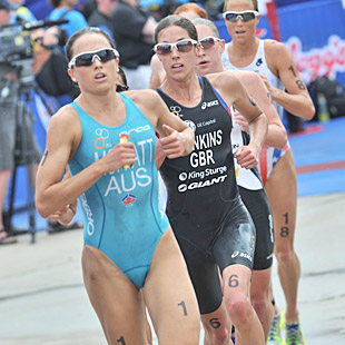 Snowy blazed out of transition with motivation — "I was angry about my position after the bike, so I used the aggression to reel in as many girls as I could." Indeed, she caught Jenkins, Bennett, Hewitt and Paula Findlay on the third of four 2.5 kilometer laps. Describing what Snowsill looked like going past, Emma Moffat said "It looked very familiar."