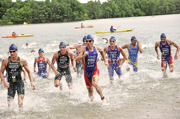 One woman jumped the gun at the swim start. But it’s not so easy to reel the field back in for a restart, so off they go.