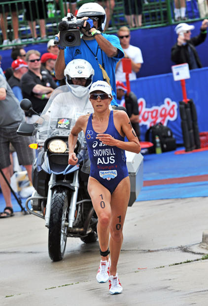 This year’s finish line sprint – 2009 World Championship Series champ Emma Moffatt tops 2008 ITU World Champ Helen Jenkins by a second.