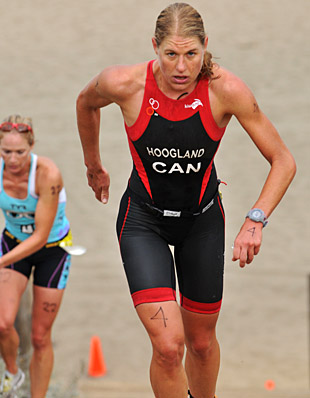 Hoogland finished the swim in a virtual dead heat with Amanda Stevens and Kristen Peterson, stayed close to Stevens' wheel on the tough bike, then made her move past Stevens climbing the infamous sand ladder at mile 4.5 of the run to take her second San Francisco win in two months by a margin of 18 seconds over Stevens and by 1:35 over third place finisher and fellow Canadian Melanie McQuaid.