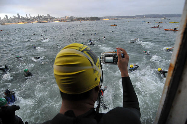 This is what the digital age has brought us: Alcatraz swimmer records himself, at the moment of takeoff, with his waterproof digital camera.