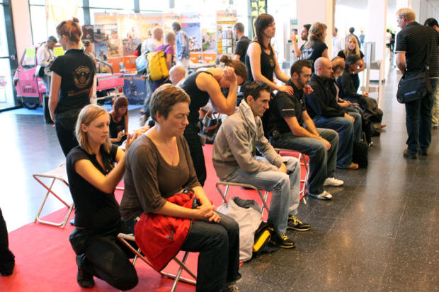 Tired and worn out exhibitors and visitors can catch a break and a back rub here.
