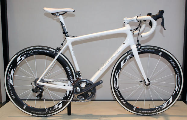 Right below the signage announcing Trek's new partnership with the team of the brothers Schleck was this beautifully subdued white Madone.