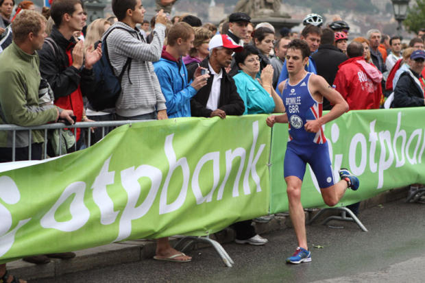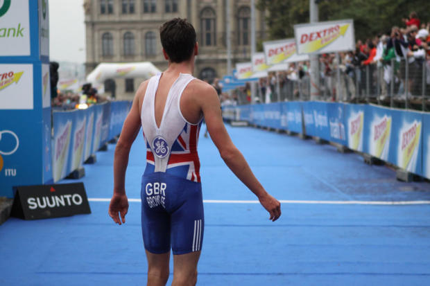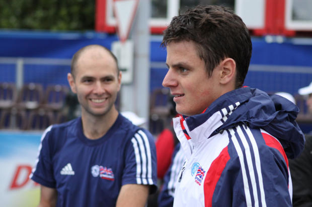 With the British coach Joel looking quite happy, the younger Brownlee is ready for the podium.