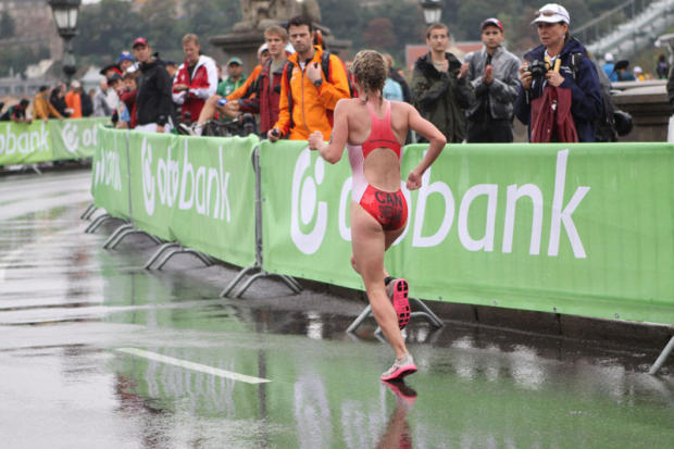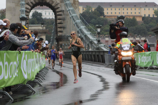 Emma Jackson was first out of the water and first on the run.