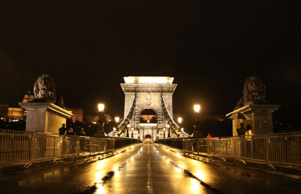 The famous Budapest Chain Bridge looks calm and quiet early in the morning.