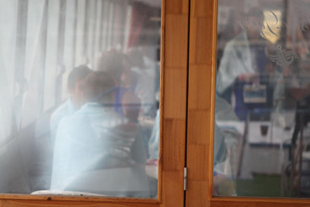 On the boat to the swim start returning age groupers steam up the windows.