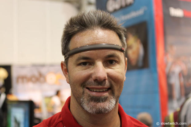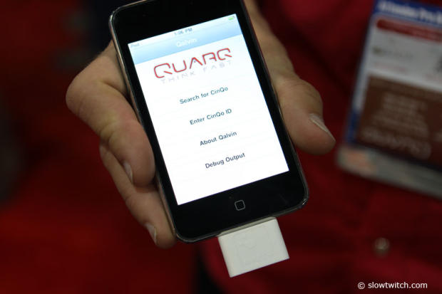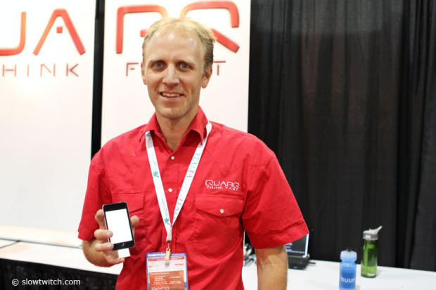 Jim Mayer of Quarq shows off the new gadget called Qalvin that speaks through the iPhone to your Quarq.