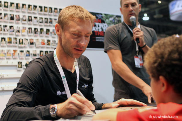 Jens Voigt signing an autograph for a young fan in the Zipp/SRAM booth with Michael Zellman moderating in the background.