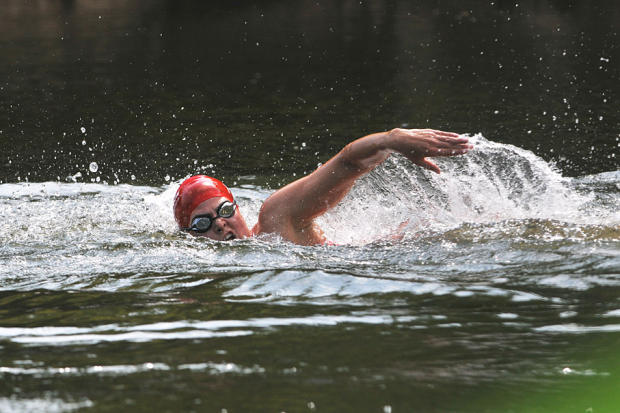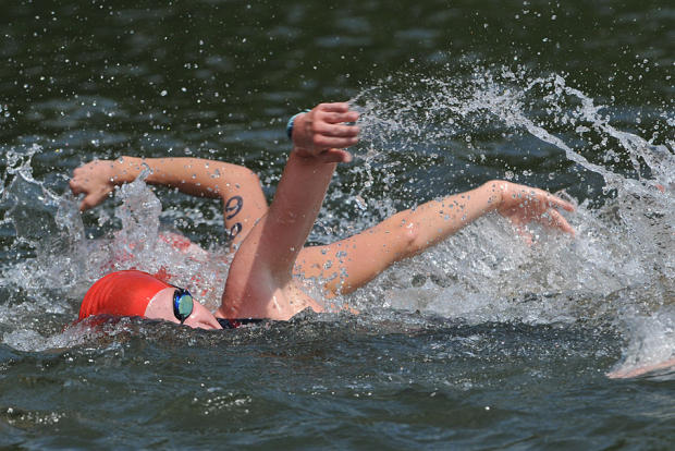 The first leg of the women’s elite swim was calm and glassy near the shore.
