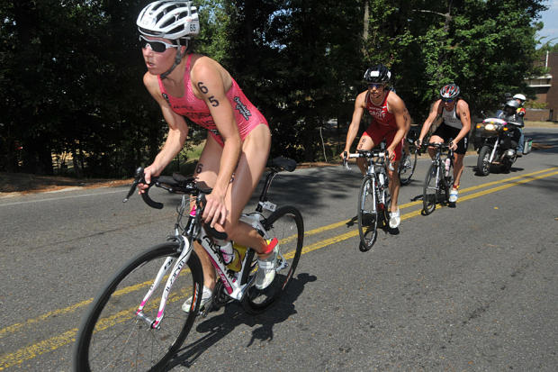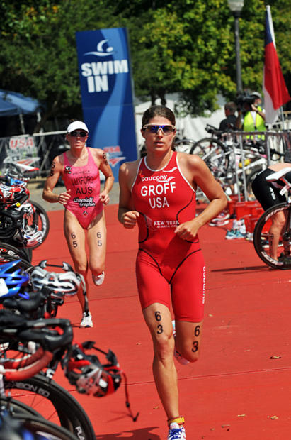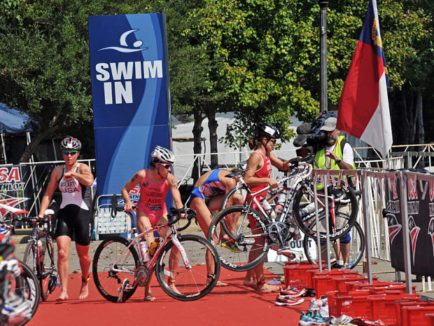 After Sarah Haskins dropped out due to a lingering ankle injury, four leading women rack their bikes to start the run.
