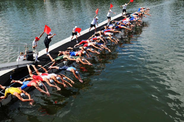 Is this what happens when mad scientists splice the genes of a champion human swimmer and an octopus? Nope. Just close quarters racing of three women in the elite wave.