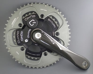 The CinQo Saturn – the second generation is here. Five arms, each precisely instrumented in a (patent pending) arrangement and now connected by the "Ring of Saturn". Add in the ANT+ Wireless Communication with the convenience of a user replaceable CR2450 battery and you've got Quarq Power! The Quarq CinQo is a bicycle powermeter that is integrated into the crankset of the bicycle. Specifically, the CinQo is a instrumented crank "spider" that mounts on specific production cranksets.