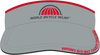 The first 100 people to donate $134 or more (only one visor per person) will each receive a limited edition – only 100 are being made – World Bicycle Relief visor. The visors feature the World Bicycle Relief logo, the Headsweats logo, the Rappstar star, and the words "Rappstar's 2010 IMAZ Charity Challenge" on the brim.