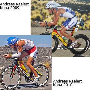 Does the list of probable customers above—long-legged, or less than ultra-steep—include Herr Raelert? Well, yes and no. Alongside are two pics of the speedy German, the top pic of Andreas at the Hawaiian Ironman in 2009, the bottom in 2010. You can only glean so much from a single set of pics, but, based on these pics, I prefer his position this year over last year. He seems to have preferred it as well, using only his bike split time as a guide. He rode 6 minutes faster during years when the bike splits seem not too different year over year (Macca was within the same minute each year, Crowie was 2 minutes faster in 2009, Lieto was 2 minuttes faster in 2010).