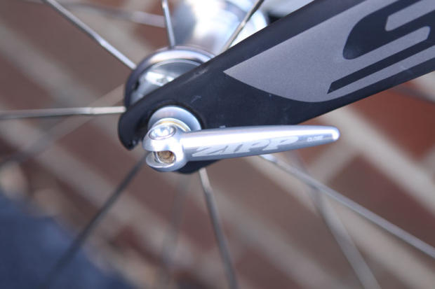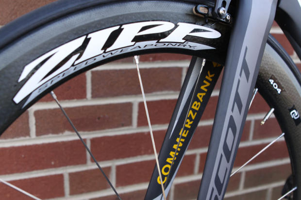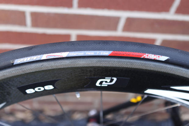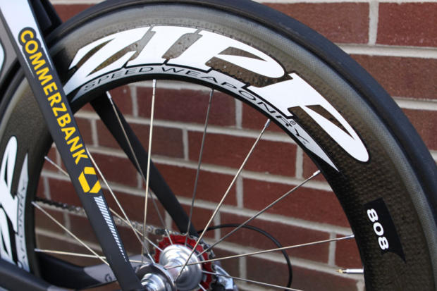 The rear Zipp 808 Firecrest carbon clincher looks quite aggressive but required a valve extender.