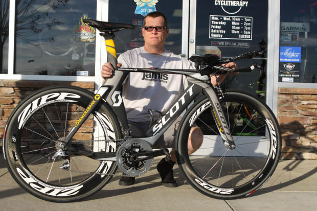 Rob Wall in front of the shop ready to take the Scott Plasma 3 for a test spin