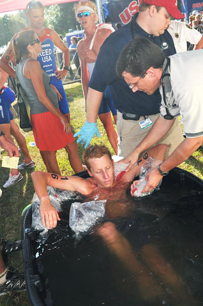 Steven Sexton cools down his overheated core in an ice bath after finishing a hot and humid Us Elite Championship in Tuscaloosa.