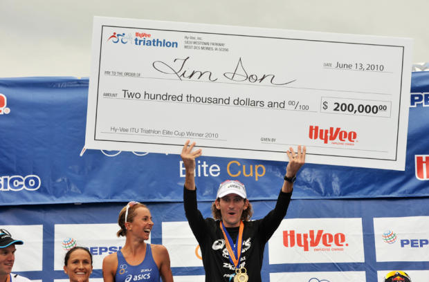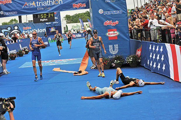 Tim Don and Kris Gemmell lay spent and exhausted after their 1-2 finish at Hy-Vee.