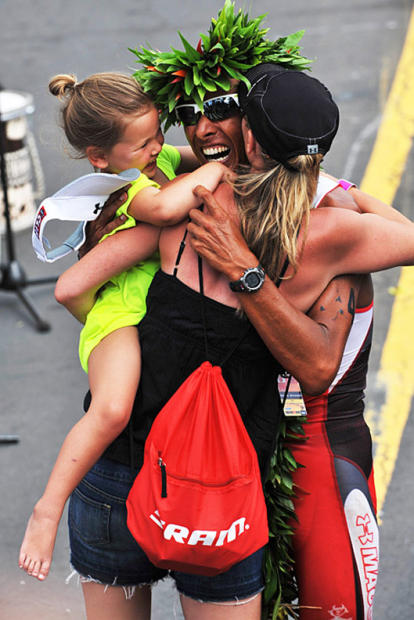 Macca and his family celebrate his stirring Kona victory with a hug.