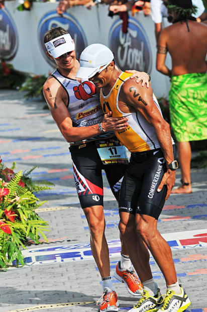 Two-time Ironman World champions Tim DeBoom (2001, 2002) and Normann Stadler (2004, 2006) had an off day but enjoyed running the final 7 miles together at Kona.